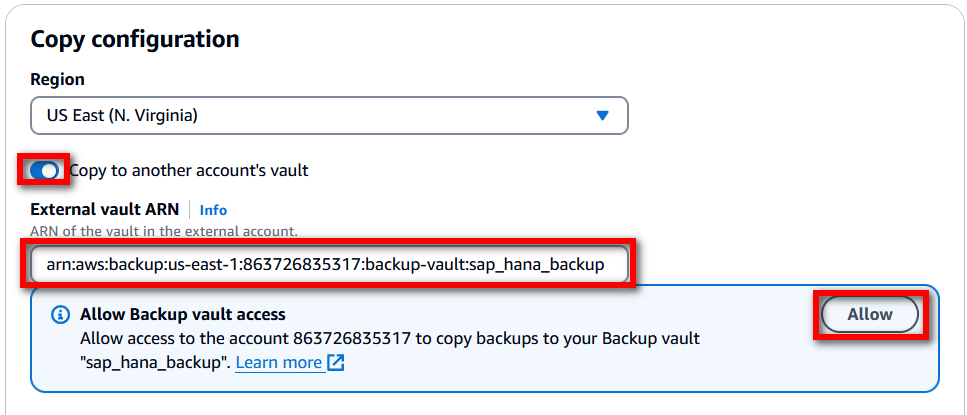 4. Toggle the Copy to another account’s vault option and provide the destination account vault ARN.