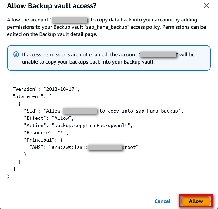 5. In the new pop-up screen under Allow Backup vault access, click Allow to provide the required permissions to the access policy to copy the backup data to your backup vault.