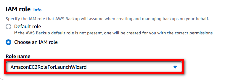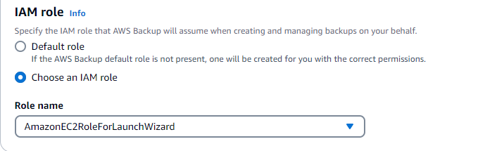 7. Under IAM role, Choose an IAM Role. Specify the IAM role that AWS Backup will assume when creating and managing backups on your behalf.