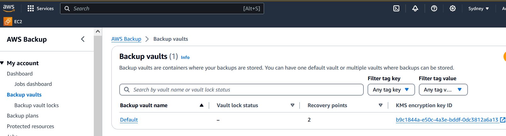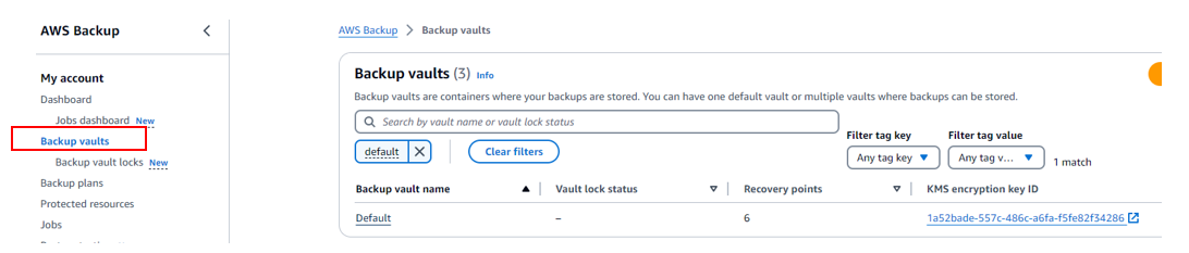 12. Choose Backup vaults and select the vault that contains the recovery point you copied from the source Region.