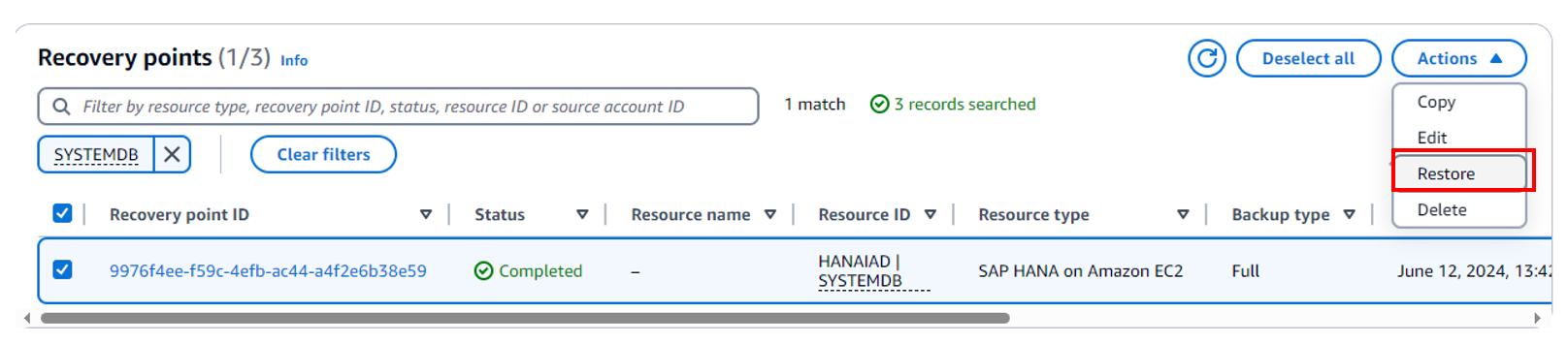 14. Select the recovery point ID of SystemDB, go to Actions drop-down and choose Restore.