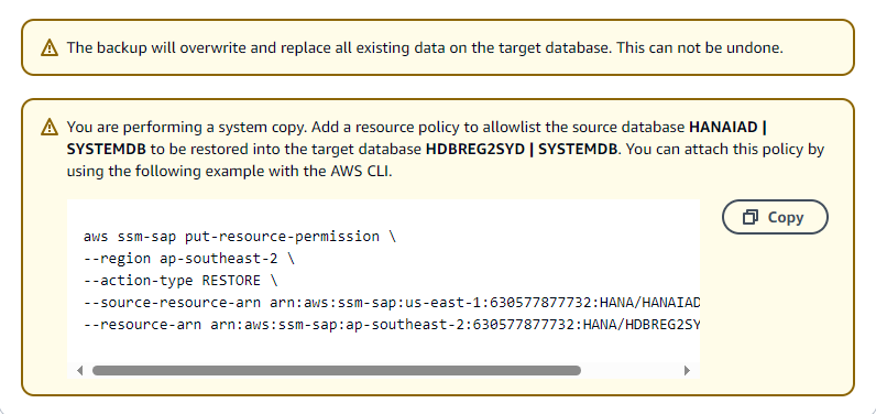 You will also see warnings as shown below, since you are performing a system copy it asks you attach a resource policy to allow-list the source database to be restored into the target database.