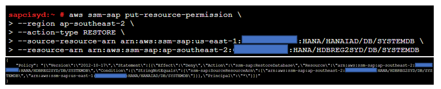 Note: The command to attach a resource policy to allow-list the source database to be restored into the target database varies for the TenantDB restore.