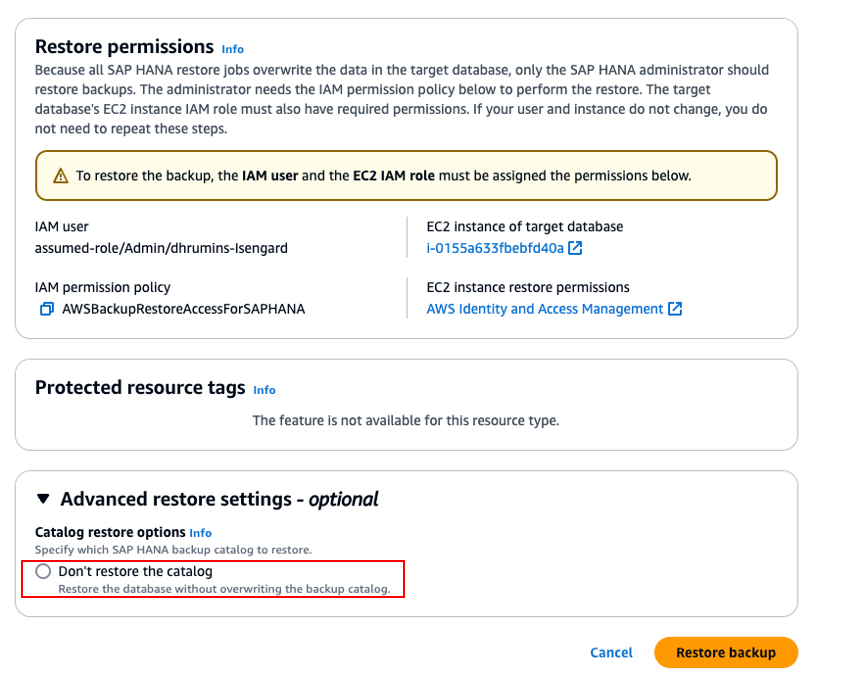 17. Switch back to the Restore SAP HANA backup console, review the Restore permissions.