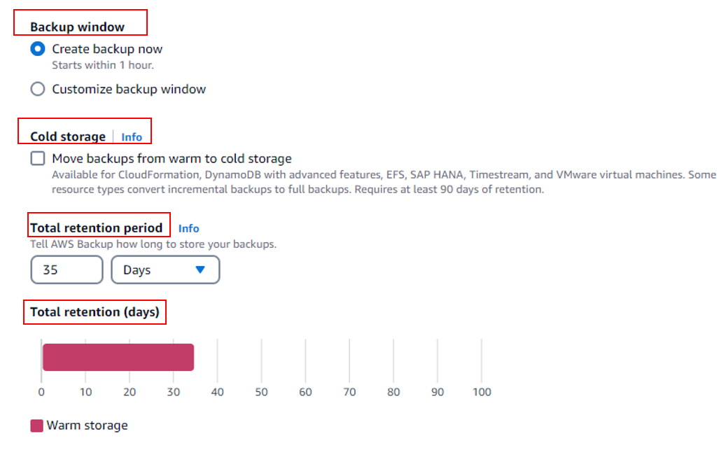 Leave the Backup window, Cold storage and Total retention period to default values or adjust them as per your requirements.