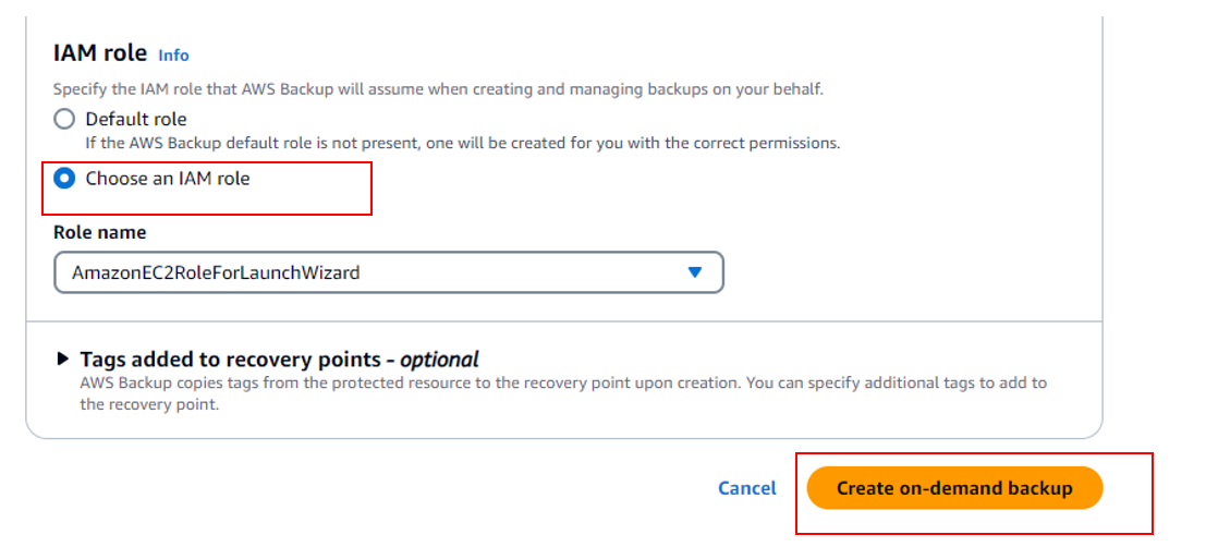 For IAM role, specify the IAM role that AWS Backup will assume when creating and managing backups on your behalf and then click on Create on-demand backup at the bottom of the page.