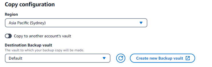 8. Under Copy Configuration choose the destination AWS Region for the copy and for the Destination Backup vault choose the destination backup vault for the copy.