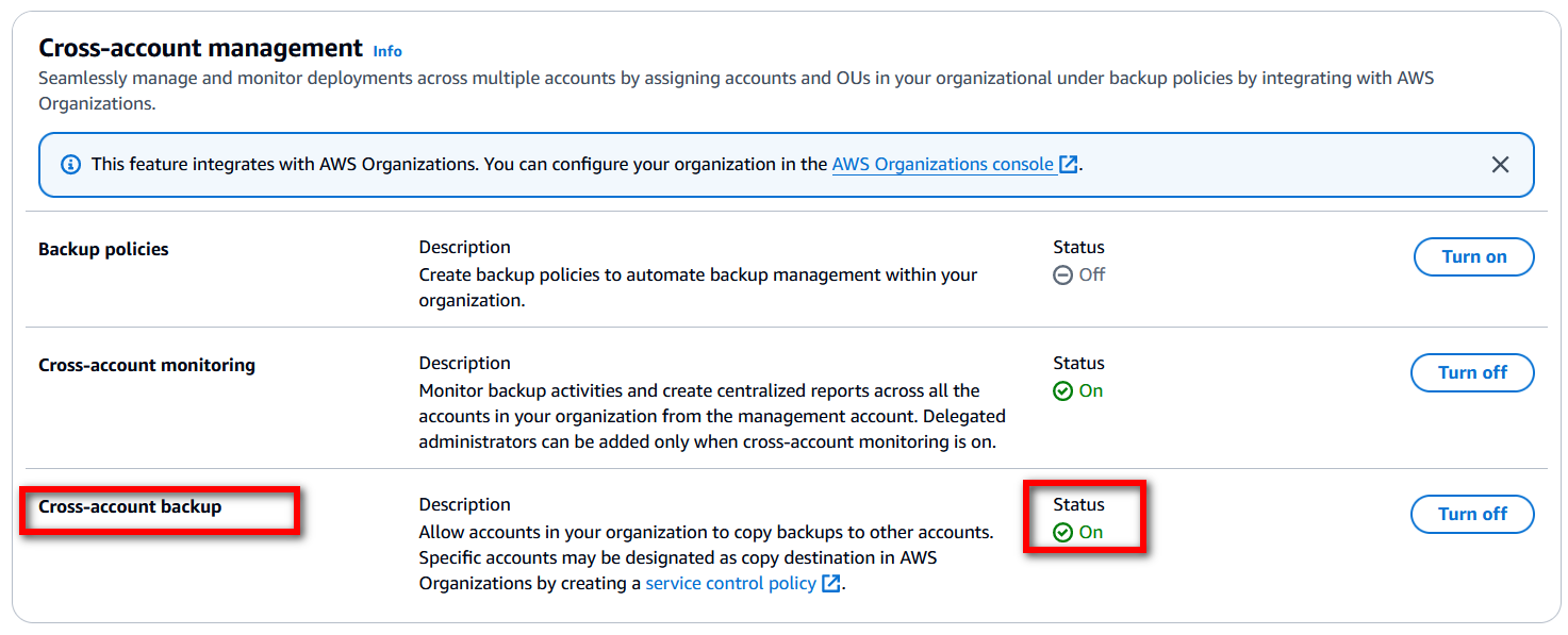 d. Under Cross-Account management, for Cross-Account backup, choose Enable. Ensure the Cross-Account backup Status shows as On.