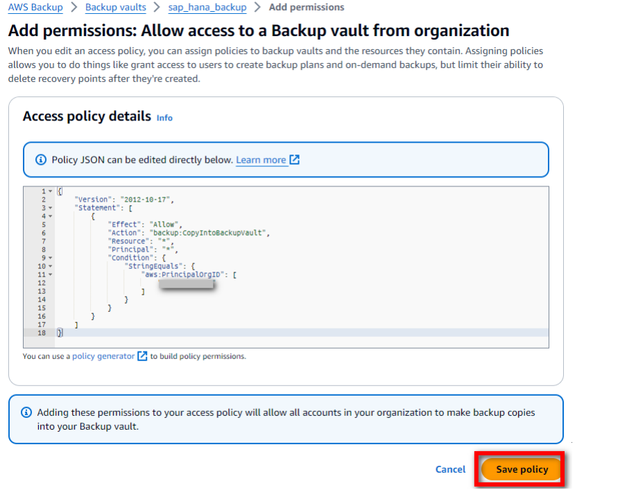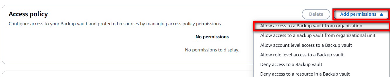c. In the Access policy section, choose Add Permissions and then choose Allow access to a Backup vault from organization. Any Cross-Account action other than backup:CopyIntoBackupVault will be rejected.