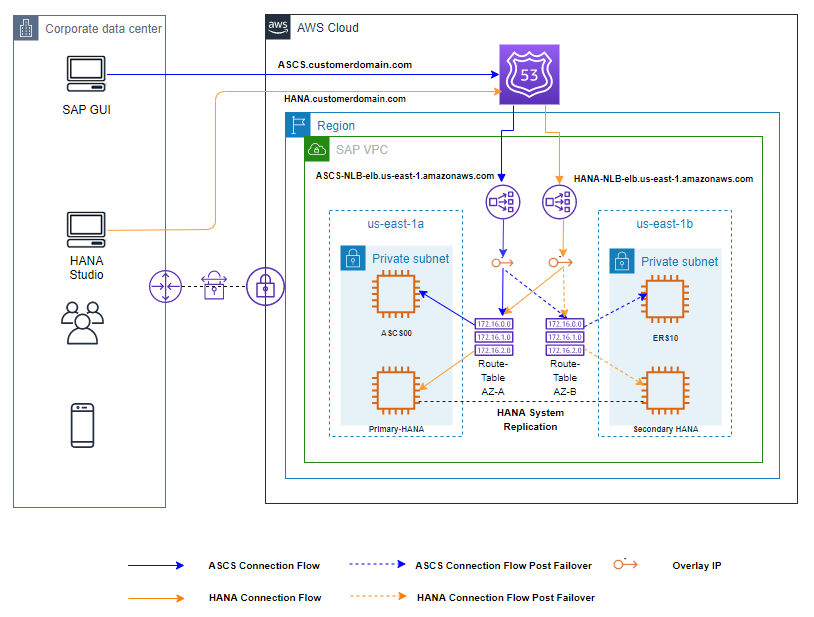 The preceding figure is the architecture representation of the SAP ABAP System Central Services (ASCS) and HANA HA setup. The ASCS, Primary HANA node, and primary application server (PAS) are deployed in Availability Zone A (us-east-1a). The Enqueue Replication Server (ERS), standby HANA database, and additional application server (AAS) are deployed in Availability Zone B (us-east-1b). There are two sets of RHEL clusters. The first is for the SAP application, and this is the setup between the ASCS and ERS instances. The second is for the HANA setup between the primary and standby HANA database (DB). The Route53 service here is used as a DNS service. This allows you to create a CNAME for the FQDN with your company domain name and NLB DNS name. You can also leverage your on-premises DNS service for the same.