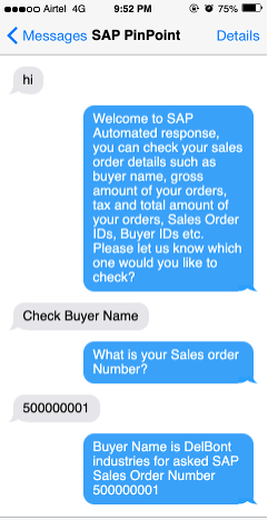 Your SMS chatbot is now set up and ready to use! You can test it by sending a message (such as “Check Buyer Name”) to the long code that you obtained earlier. The chatbot responds, asking which sales order you want to check.