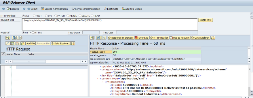 Below is a screenshot of SAP Gateway Client that shows fetch Sales Order OData service.