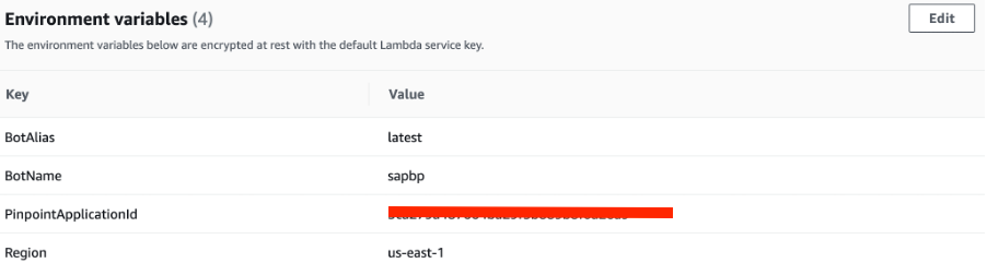 In the Environment variables section of this lambda, add the variables like BotName : sapbp, BotAlias : latest, PinpointApplicationId : The project id of the Pinpoint project and Region: The AWS Region of your Pinpoint project.