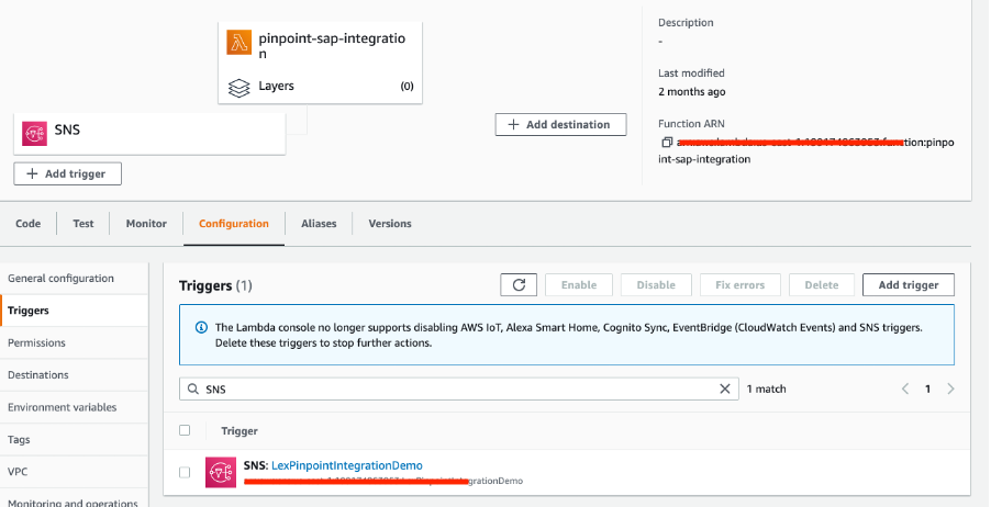 Now create a Lambda function to connect with pinpoint. This lambda function can be created by using step-3 of a blog Create an SMS Chatbot with Amazon Pinpoint and Lex and save this lambda as pinpoint-sap-integration. In the Designer section of this lambda function, choose Add trigger. Add a new SNS trigger, and then choose the LexPinpointIntegrationDemo topic that you created earlier in step-4