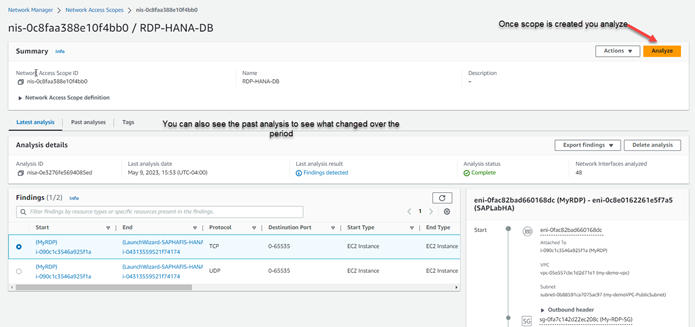 Summary – Network Access Scope in AWS provides visibility into inbound and outbound traffic patterns, including sources, destinations, paths, and traffic types for your systems. This is crucial for ensuring proper network access controls and security, such as allowing legitimate traffic to SAP HANA databases from remote hosts while preventing unauthorized access.