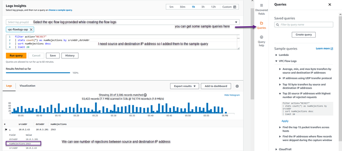 You may also filter by the customer time stamp to see details. There are sample queries on the right side for finding the IP addresses where flow records were skipped, top packet transfer across hosts, etc.