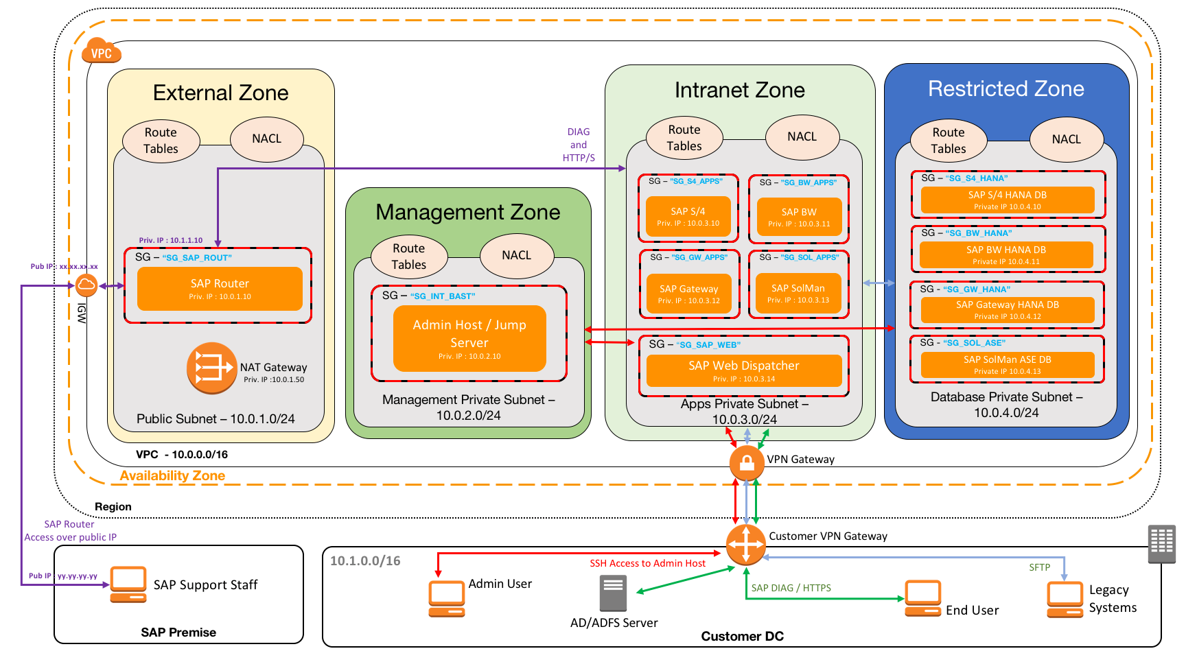 - Management / shared services zone: Applications like Active Directory, monitoring servers, SAP Solution Manager, or DNS servers, which are required by all the zones described above, are hosted in this zone.