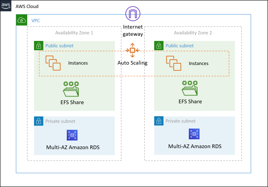 In this software architecture, a VPC with an internet gateway has four subnets are located in two Availability Zones. Two of those are public subnets and indicated with a green background, and two are private subnets, indicated with a blue background. In each of the two public subnets, a set of Amazon EC2 instances is launched with an Auto Scaling group to achieve high software availability. Amazon EFS is mounted to the instance for file data storage and sharing. One Amazon RDS is used for data storage in two private subnets. Refer to the following topology diagram.