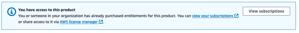 Once you distribute an entitlement to an account, the product description page shows a banner that a license entitlement has been shared to that account. The following screenshot shows an entitlement banner indicating that the account has access to a product. It also has links for the user to view their subscriptions and share access to it through AWS License Manager.