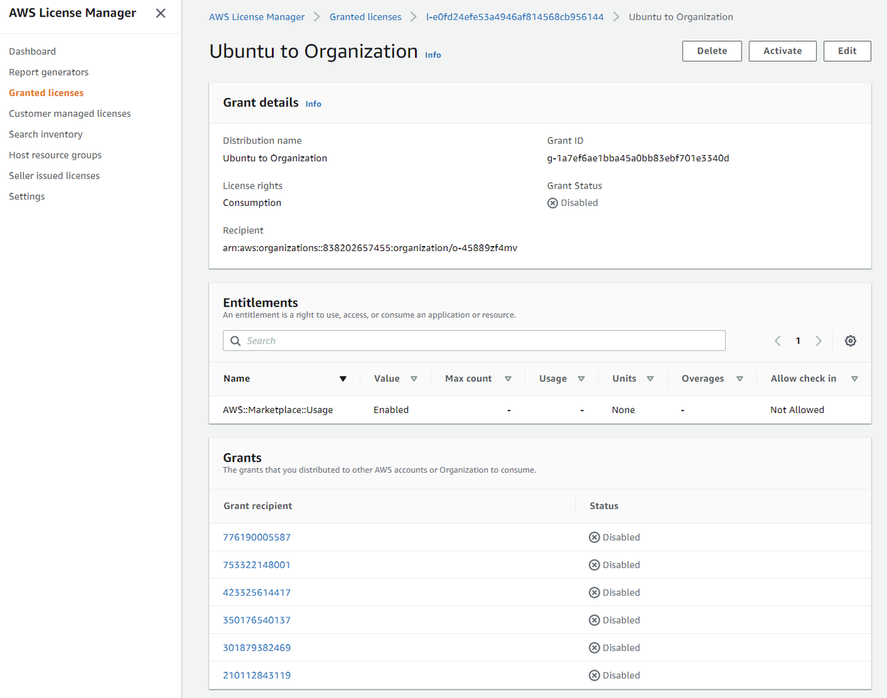 - Activation and deactivation of licenses to an organization ID triggers individual license activations at the AWS account level. In some cases, account-level licenses might not activate due to existing licenses already active in those accounts. To check account-level grant statuses, on the Granted licenses page, choose the name of the AWS Organizations grant to see the grant’s details page.