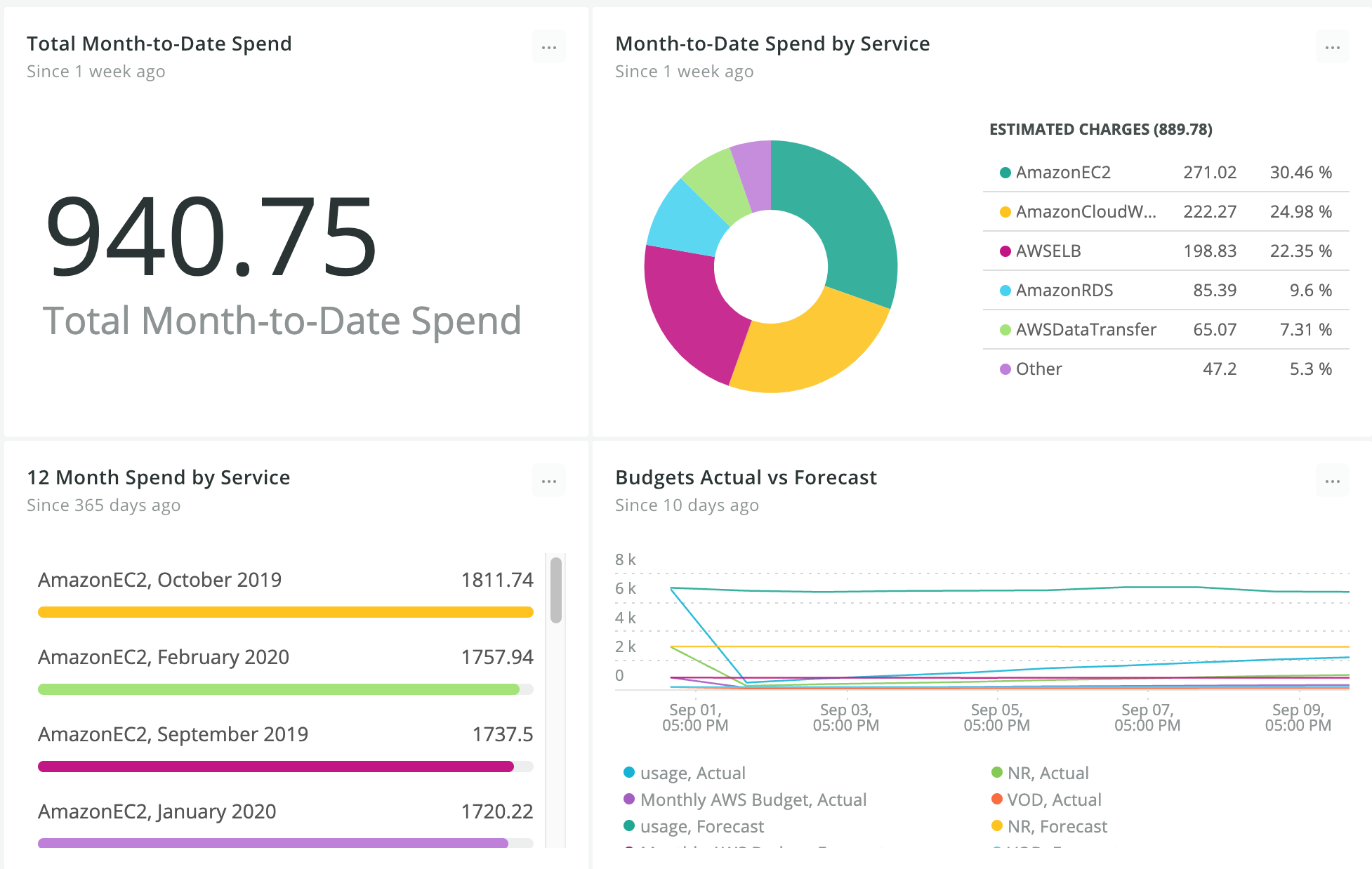 For tracking and forecasting your AWS cost against the set budgets, you can build a dashboard that plots the data collected from AWS Billing and Cost Management integration. The following dashboard captures: