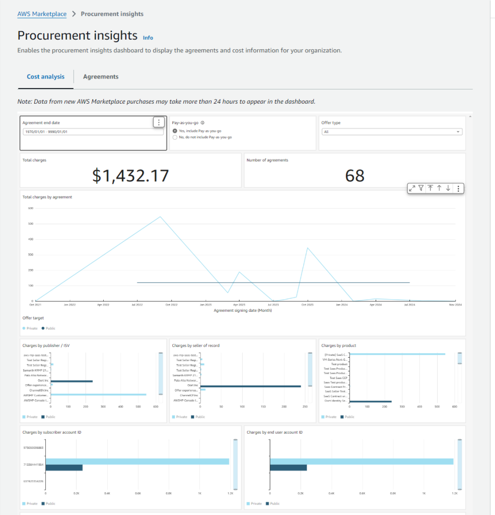 Data in the Procurement insights dashboard is sourced and validated from multiple data sources. As a result, new AWS Marketplace purchases can take over 24 hours to appear in the dashboard.