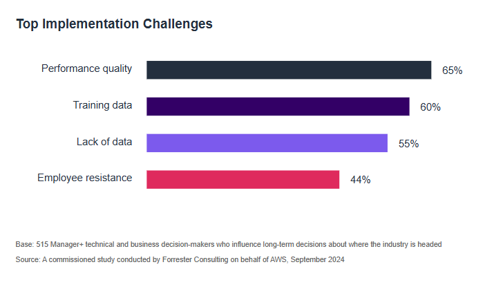 However, adoption challenges persist. The study found, as shown in Figure 2, that 65 percent of organizations struggle with poor generative AI performance and quality issues. Over half lack the necessary datasets to effectively implement generative AI solutions.
