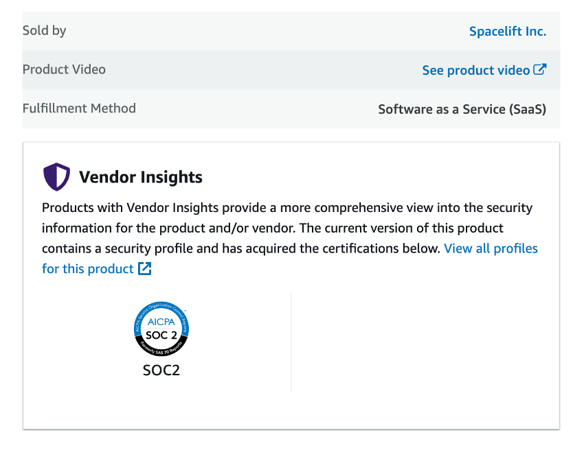 In this post, we described the challenges faced by software buyers and sellers as they seek to complete security and compliance risk assessments as part of the procurement process. We discovered how AWS Marketplace Vendor Insights addresses those challenges. We also learned from software vendor Spacelift about how they have used Vendor Insights to demonstrate a strong security posture and complete transactions more quickly.
