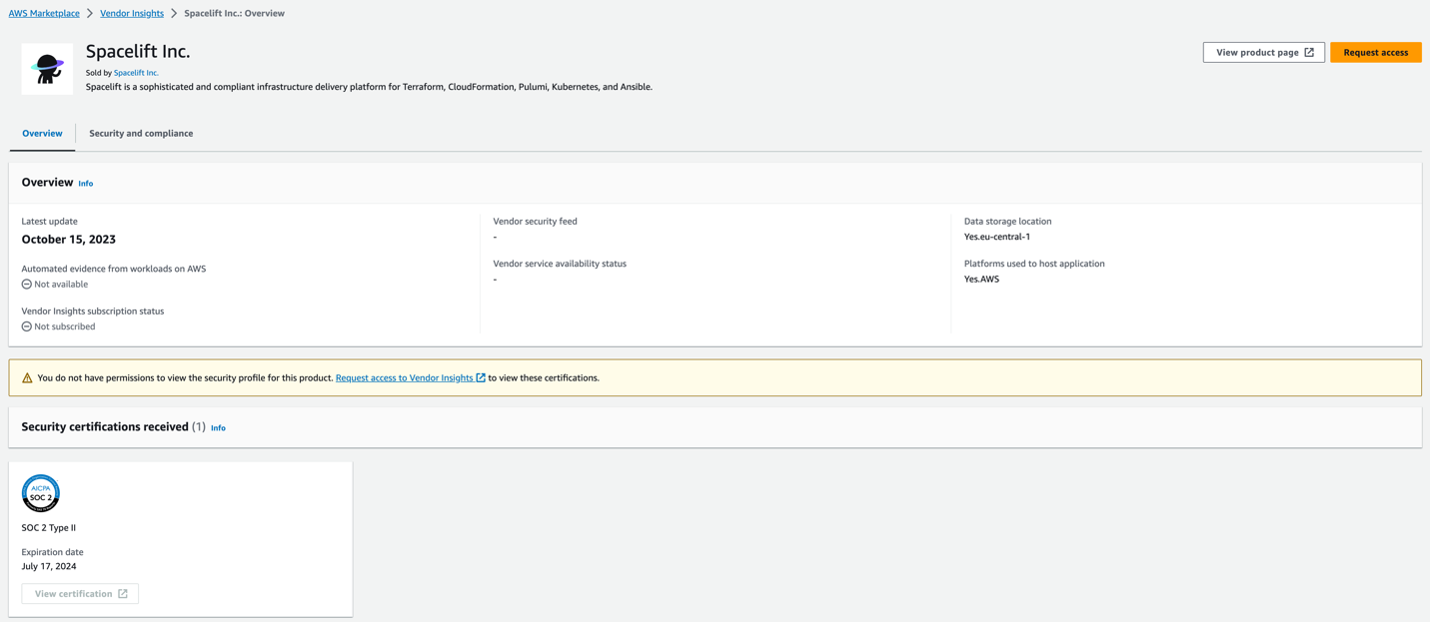 Third, Spacelift’s sales team has experienced greater efficiency and accelerated deal closures by adapting their sales processes to include Vendor Insights when possible. In scenarios in which customers are purchasing through AWS Marketplace, Spacelift’s sales team has been trained to route requests for security and compliance information through Vendor Insights. In these cases, they advise buyer procurement teams to use the request access feature on the Vendor Insights profile, saving several weeks when compared to the legacy approach. Spacelift’s sales team has been very happy with the ability to close deals faster by proactively sharing required data with customers via Vendor Insights.