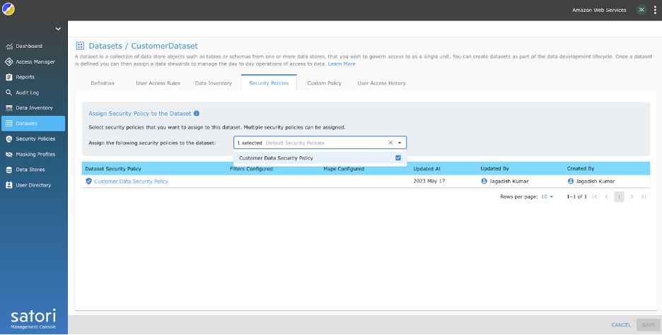 - Associate the created security policy with the datasets by editing the dataset and navigating to the Security Policies tab.
