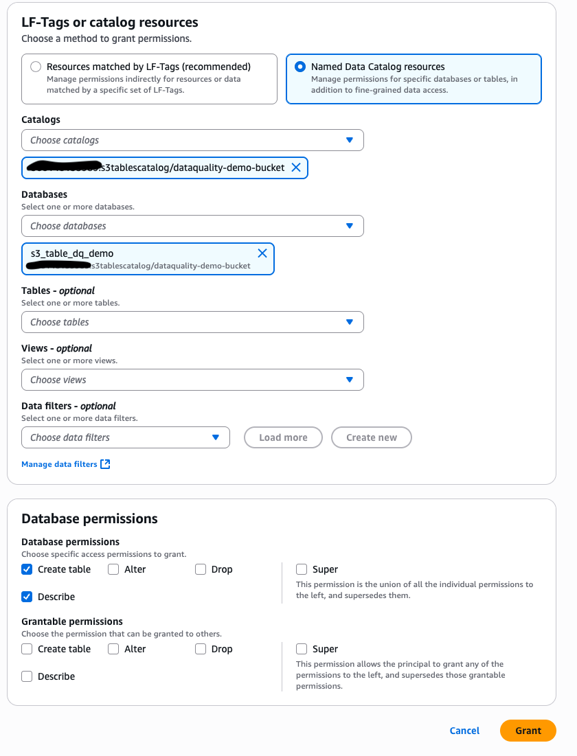 <stack_name>-DataQualityRole-<xxxxxx>) the necessary Lake Formation permissions by choosing the Grant link in the Actions tab. Choose Select, Describe from Table permissions for the new Apache Iceberg table. - To verify the S3 table in the S3 table bucket, navigate to Databases in the Lake Formation console with your Lake Formation data lake administrator permissions. Make sure the selected catalog is your S3 table bucket catalog: