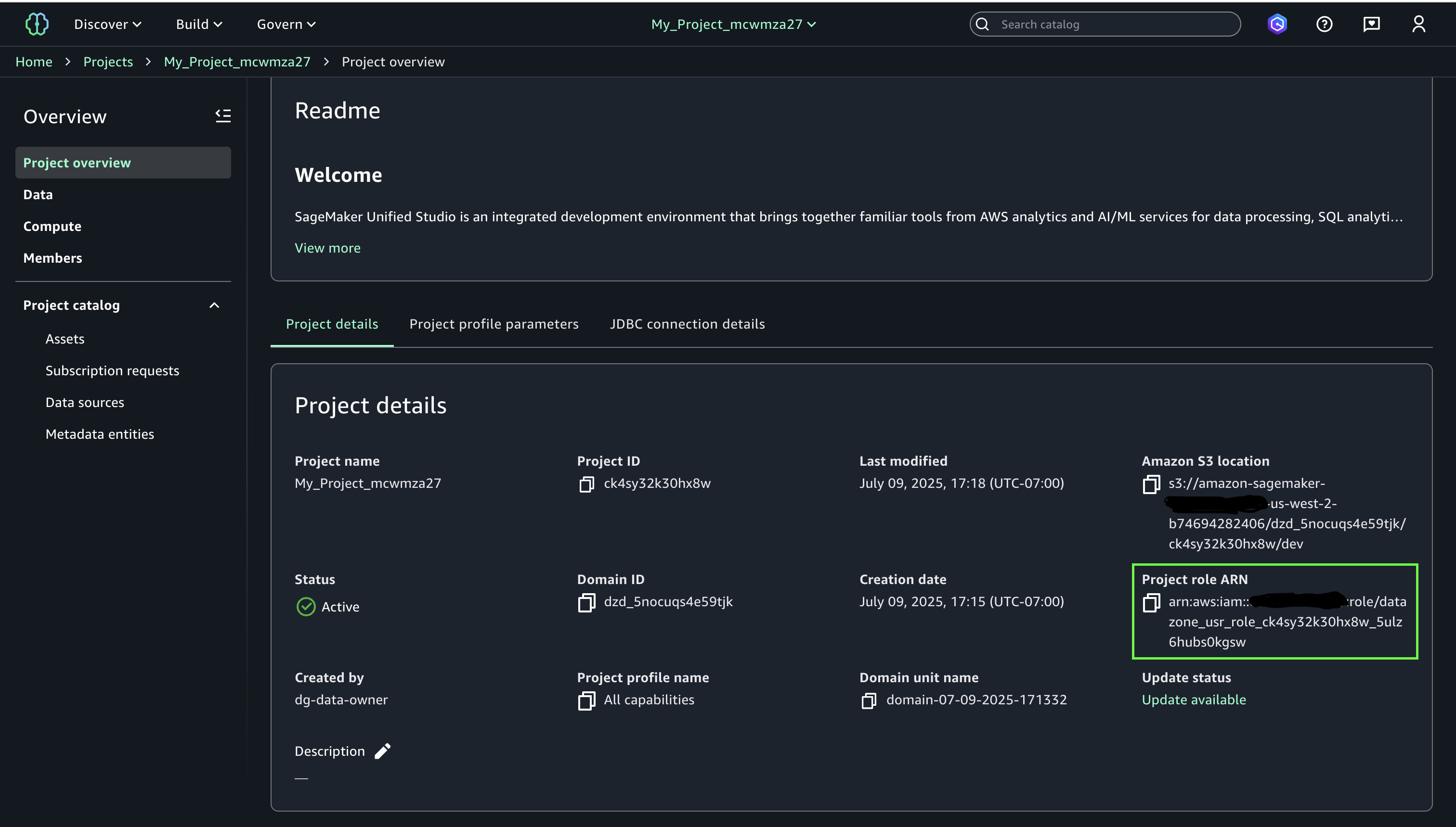 - Follow the steps at Create an Amazon SageMaker Unified Studio data source for AWS Glue in the project catalog to configure your data source for your
