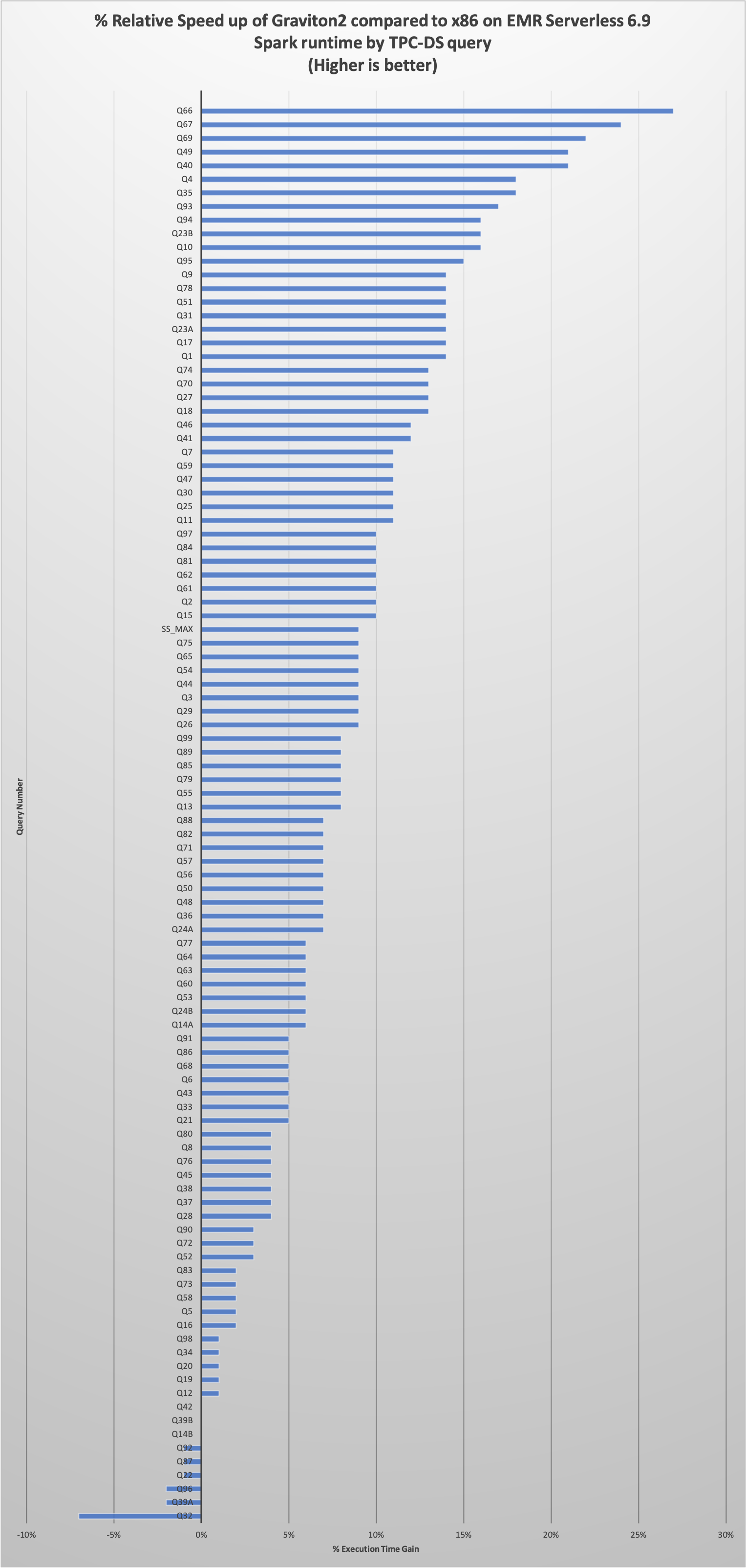 - q32 regressed by 7%; the difference between average runtime is <500 milliseconds (11.09 seconds for Graviton2 vs. 10.39 seconds for x86)