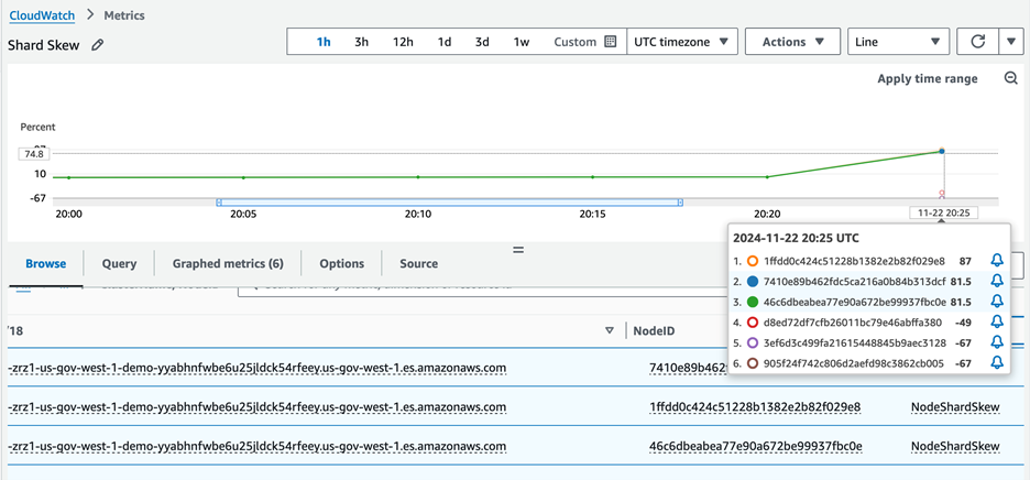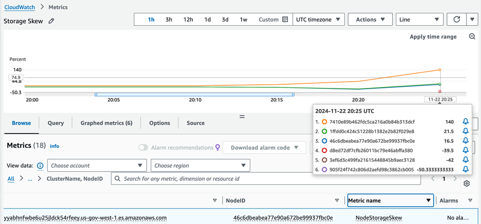 The storage skew metrics will be similar to the above screenshot. Storage skew metrics shows the domain storage skew. If you hover over the graph, it shows the node list with available nodes in the domain. This list is sorted by the storage size (largest to smallest). The Lambda function will periodically post the latest storage skew results.