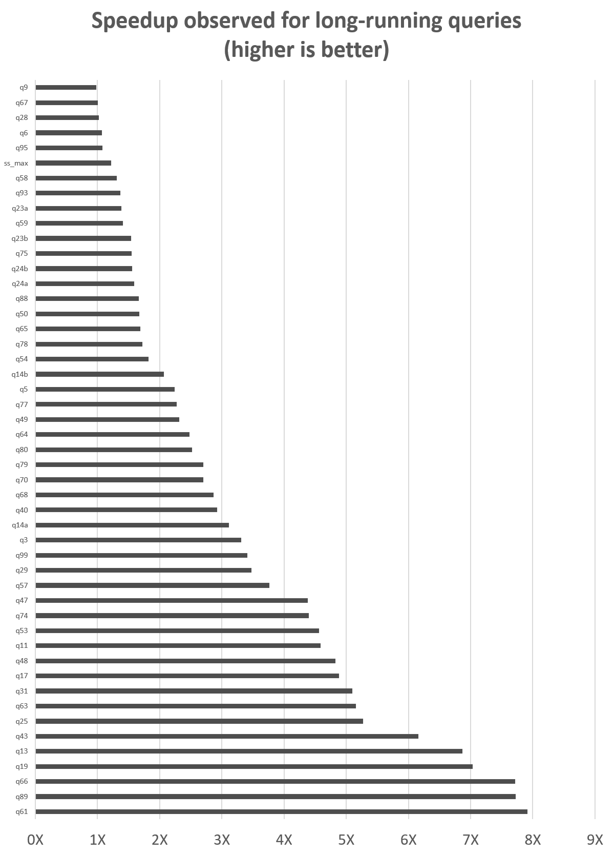 Queries running for less than 60 seconds are up to 6 times faster, as seen in query 98. Queries running for more than 60 seconds are up to 7.9 times faster, as seen on query 61, with one query, query 72, at 421 times faster with EMR runtime than without.
