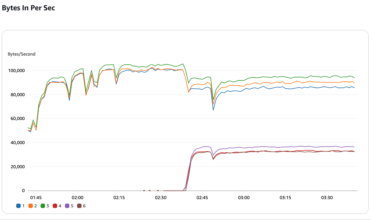 Scaling test: We’ll start by creating an Amazon MSK Express brokers cluster with 3 brokers. We’ll then rapidly scale the cluster up to 6 brokers and back down to 3 brokers, simulating a sudden spike in workload. With Intelligent Rebalancing enabled, you’ll see that the rebalancing of partitions is completed within 5-10 minutes, so that the cluster can sustain the increased throughput without any drop in performance.