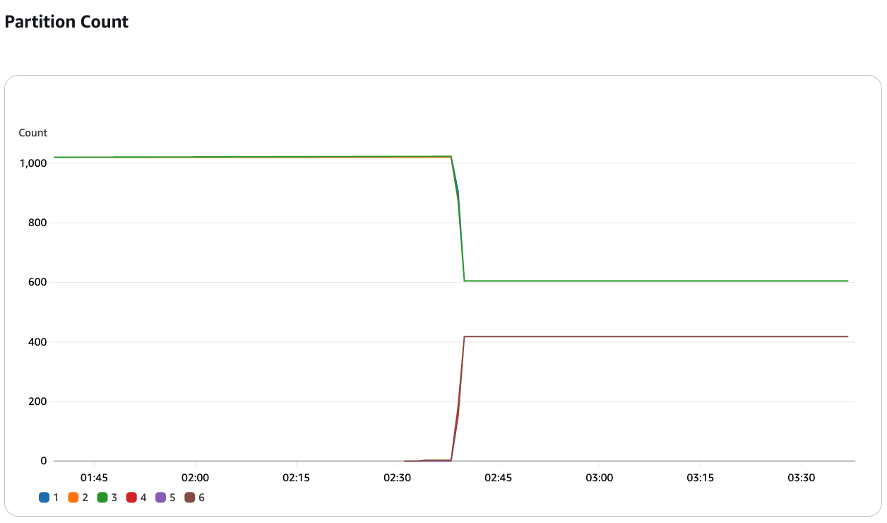 - Scaling in and out clusters: When customers add or remove brokers from their Amazon MSK Express brokers clusters, Intelligent Rebalancing automatically redistributes partitions to balance resource utilization across the brokers. This ensures that the cluster continues to operate at peak performance, making scaling in and out possible with a single update operation.