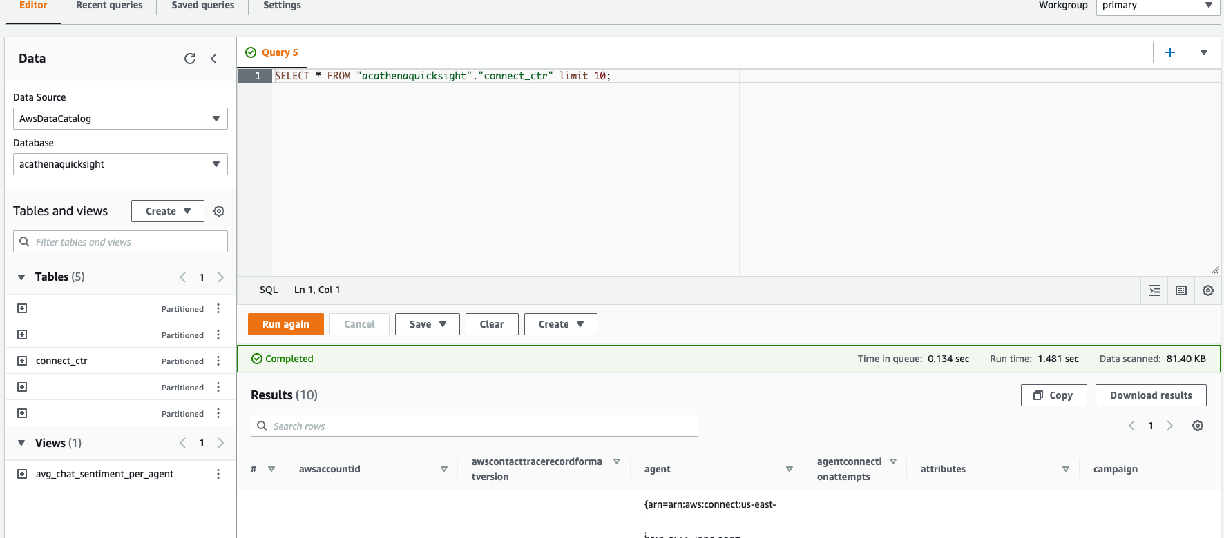 - To query the data with Amazon Athena, we you can select the ‘connect_ctr’ table, and for Action choose ‘View data.’