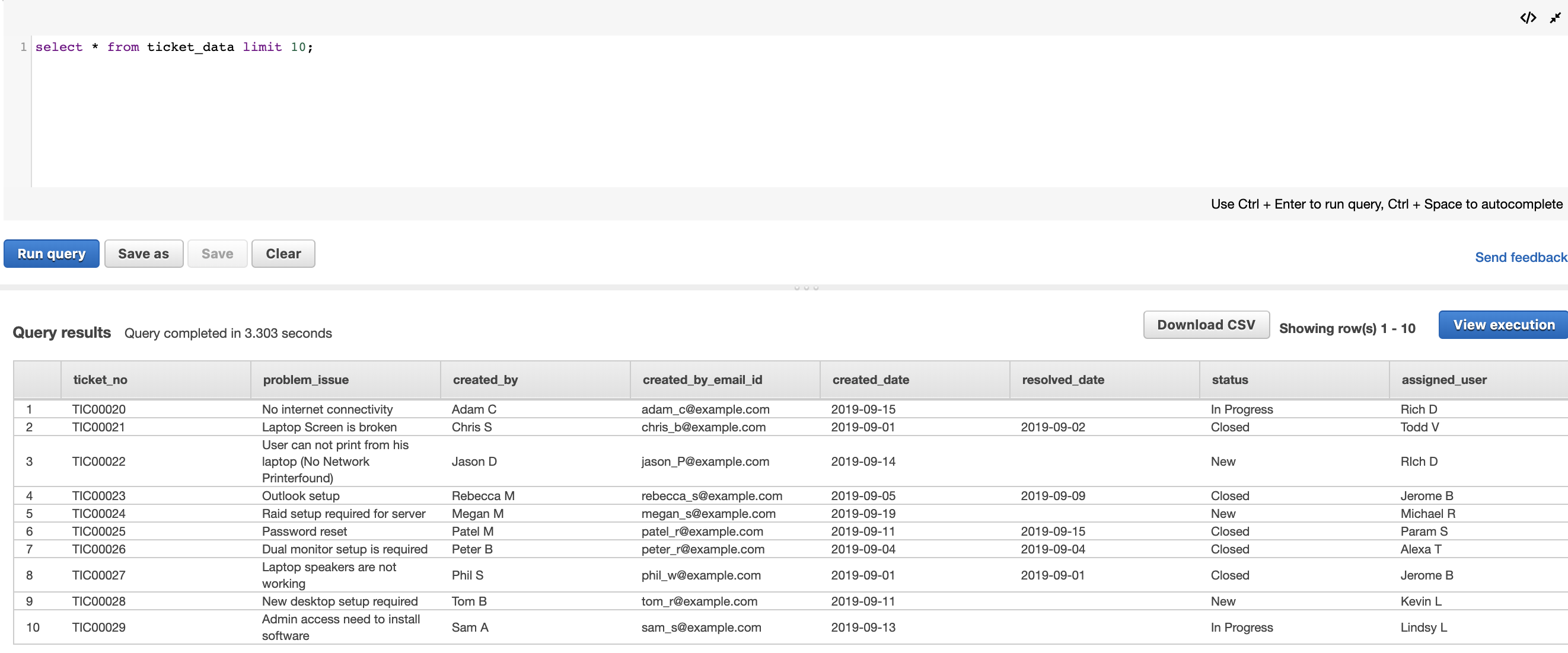 For this post, we assume that the IT support ticketing data is already loaded into Amazon Redshift. The important columns of interest in this dataset are ticket_no, which can be a primary key for this table, and assigned_user_email_id, which we use as a foreign key to join with the flattened LDAP dataset. We refer to this table as ticket_data. You can query this table in your Amazon Redshift cluster, as shown in the following screenshot.