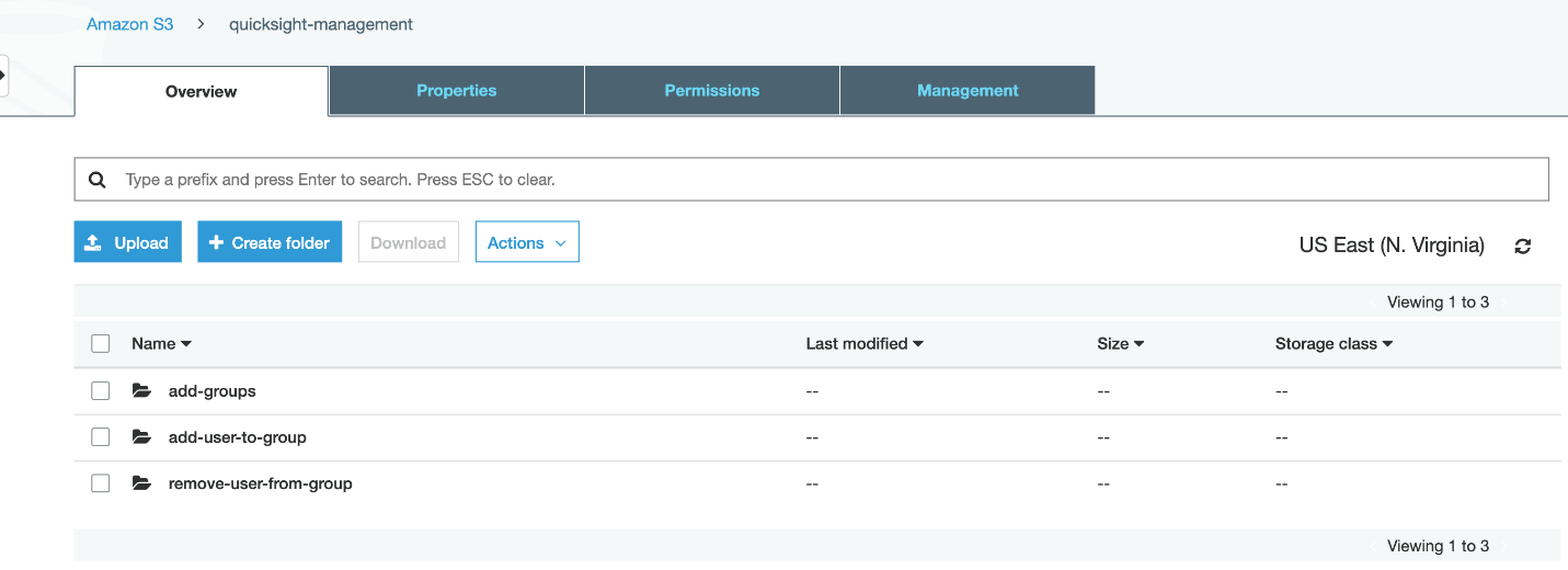 To tie it all together, we automate user and group management. When a particular user is added to a group, they get access as defined by the preceding permissions file. For this setup, we use the following Amazon S3 prefix structure, essentially a separate path for adding groups, adding users, and removing users.