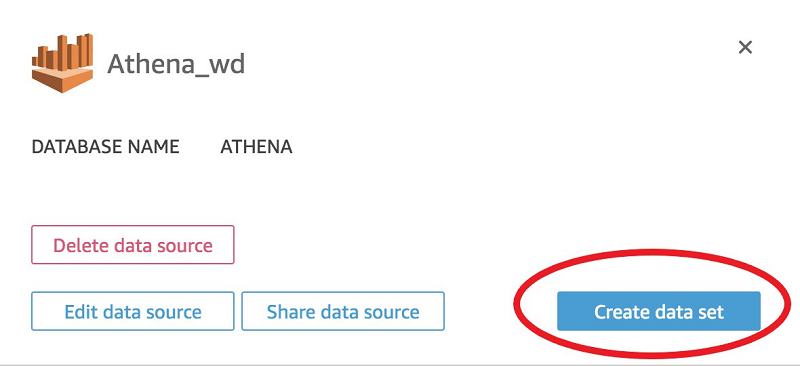 You use Athena as the source for your dataset. If you don’t have an existing Athena data source, you can create a new one. For instructions, see Creating a Data Source.
