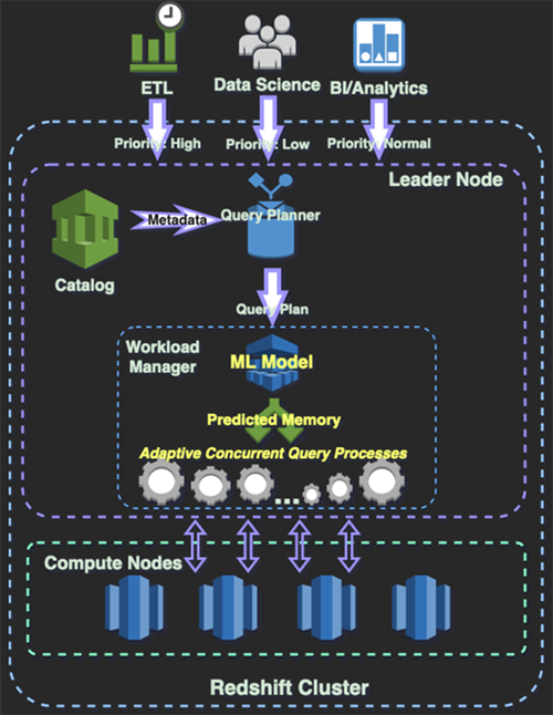 Amazon Redshift has recently made significant improvements to automatic WLM (Auto WLM) to optimize performance for the most demanding analytics workloads. With the release of Amazon Redshift Auto WLM with adaptive concurrency, Amazon Redshift can now dynamically predict and allocate the amount of memory to queries needed to run optimally. Amazon Redshift dynamically schedules queries for best performance based on their run characteristics to maximize cluster resource utilization.