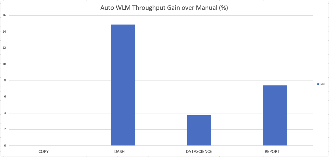 We noted that manual and Auto WLM had similar response times for COPY, but Auto WLM made a significant boost to the DATASCIENCE, REPORT, and DASHBOARD query response times, which resulted in a high throughput for DASHBOARD queries (frequent short queries).