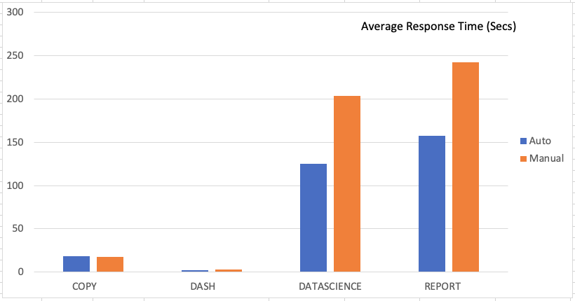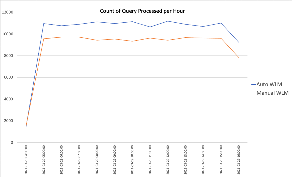 In this post, we discuss what’s new with WLM and the benefits of adaptive concurrency in a typical environment. We synthesized a mixed read/write workload based on TPC-H to show the performance characteristics of a workload with a highly tuned manual WLM configuration versus one with Auto WLM. In this experiment, Auto WLM configuration outperformed manual configuration by a great margin. From a throughput standpoint (queries per hour), Auto WLM was 15% better than the manual workload configuration. Overall, we observed 26% lower average response times (runtime + queue wait) with Auto WLM.
