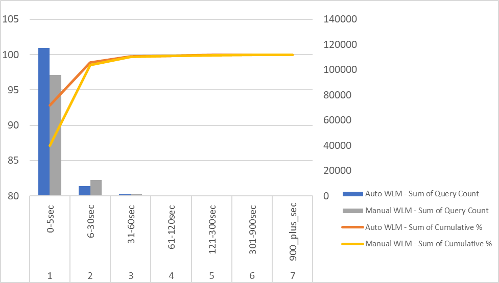 The following results data shows a clear shift towards left for Auto WLM. More and more queries completed in a shorter amount of time with Auto WLM.
