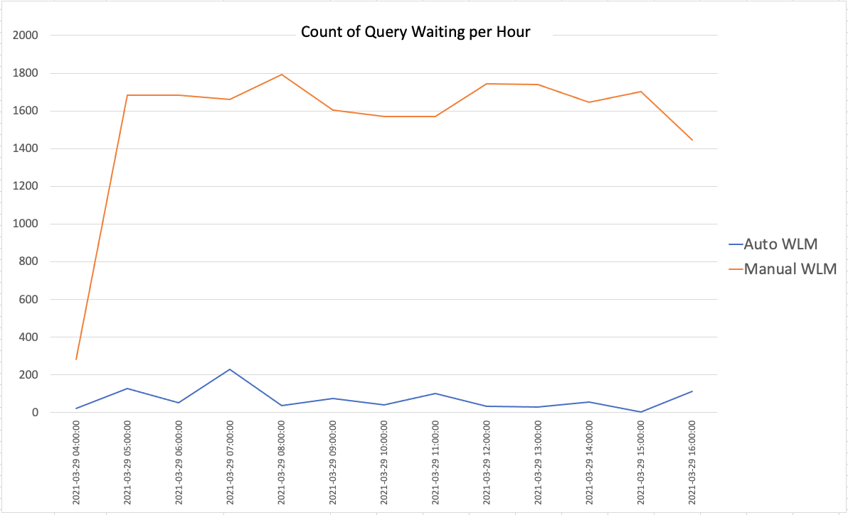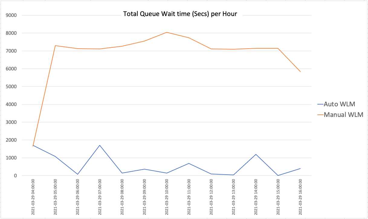 As we can see from the following charts, Auto WLM significantly reduces the queue wait times on the cluster.