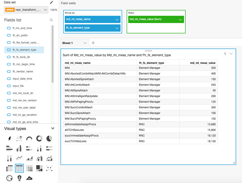 The following screenshot shows an Amazon QuickSight analysis created from an Amazon QuickSight dataset. The dataset is based on the table that AWS Glue defined, and you query it via Athena.