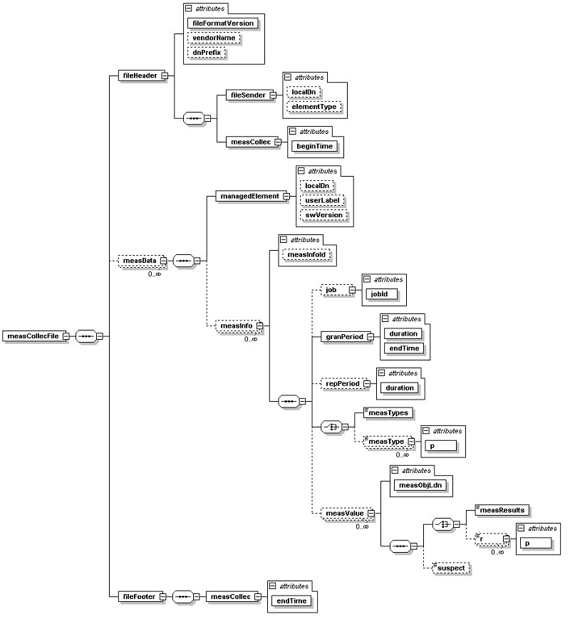 The following schema from 3GPP describes the XML format for PM that is exported from network elements.