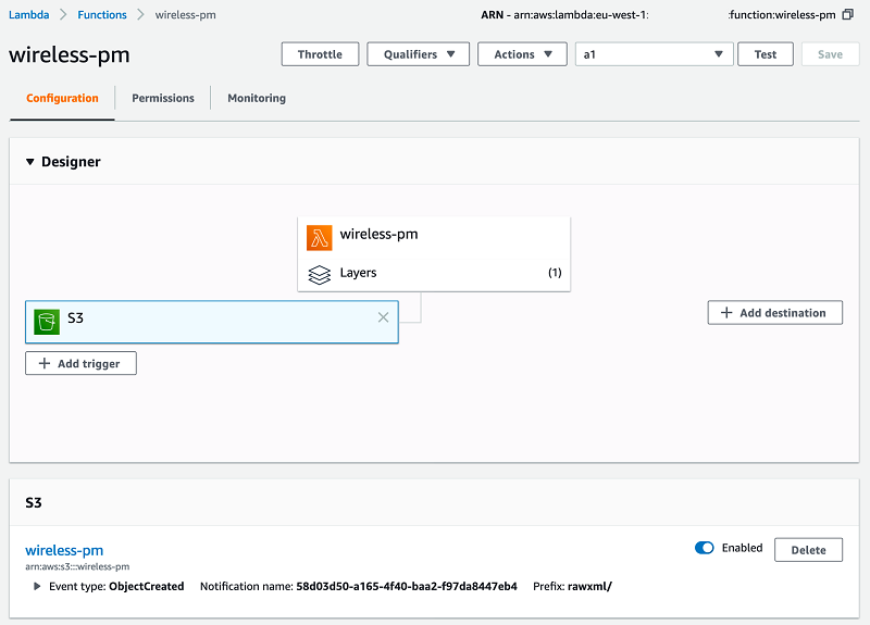 This post provides a Lambda function that is associated with the ObjectCreated event type of the destination S3 bucket rawxml prefix (s3://wireless-pm/rawxml). The function runs every time a new XML file is saved in this location.
