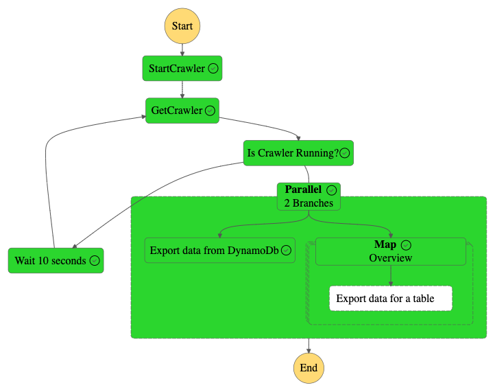 One of the common functionalities involved in data pipelines is extracting data from multiple data sources and exporting it to a data lake or synchronizing the data to another database. You can use the Step Functions distributed map state to run hundreds of such export or synchronization jobs in parallel. Distributed map can read millions of objects from Amazon Simple Storage Service (Amazon S3) or millions of records from a single S3 object, and distribute the records to downstream steps. Step Functions runs the steps within the distributed map as child workflows at a maximum parallelism of 10,000. A concurrency of 10,000 is well above the concurrency supported by many other AWS services such as AWS Glue, which has a soft limit of 1,000 job runs per job.